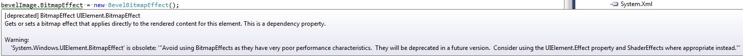 微軟放棄使用這個API的原因,很大程度上是這種效果是由軟件渲染的,其代價就是如果在項目中有比較多這種效果,則會占用大量的性能。而微軟在WPF中主要是推薦由硬件去渲染這些特效的,所以保留了Effect,新加入了ShaderEffect,推薦使用著色器來提升效果,感興趣的園友可以去研究。