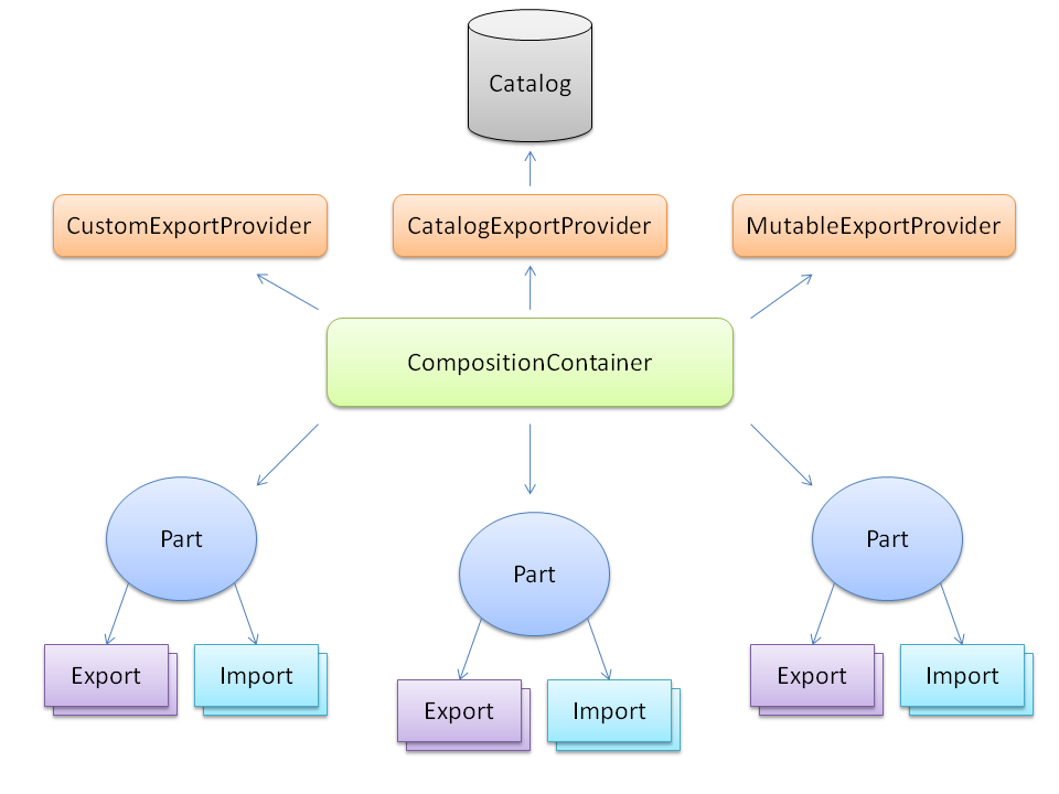 (5)ComposablePartCatalog:可組合組件目錄,用于發(fā)現(xiàn)組件,這些組件可能來自物理目錄、網(wǎng)絡(luò)存儲(chǔ)等。