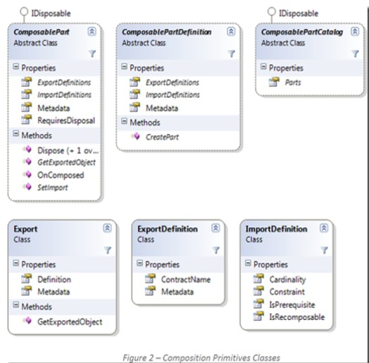 (1)ComposablePart:即可組合組件,是組合基元的核心類。ExportDefinitions表示該組件提供的功能的描述;而ImportDefinitions則是對(duì)引用其它組件功能的約束的描述。Metadata是對(duì)組件自身的特殊標(biāo)識(shí),當(dāng)一個(gè)ComposablePart通過Import引用其它組件功能時(shí),元數(shù)據(jù)可能作為滿足引用功能的約束的一個(gè)條件。