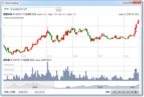 本想自己用GDI繪圖, 通過數(shù)據直接繪制一張蠟柱圖, 但覺得這樣子的功能比較少, 所以到網上搜索一些能畫出K線圖的控件. 發(fā)現(xiàn)DynamicDataDisplay挺好的, 在它的開發(fā)截圖里也發(fā)現(xiàn)可以繪制蠟柱圖, 但文檔好像做的不是很好, 不知道怎么用它來畫, 在尋找它比較好的例子的時候發(fā)現(xiàn)有人推薦用amCharts繪制, 所以便去看了一下, 發(fā)現(xiàn)挺好用的, 效果如下: