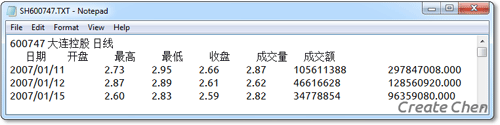 至此, 關于控件的界面方面就是這些內容. 上面提到了綁定了程序里的Data, 這個Data是怎么來的呢? 數(shù)據是從國信金太陽網上交易專業(yè)版里下載的日線數(shù)據, 這個數(shù)據格式還是比較有規(guī)則的, 第一行表示股票信息, 第二行表示數(shù)據類型, 接下來就是數(shù)據了, 每個數(shù)據之間用\t制表符分隔開.
