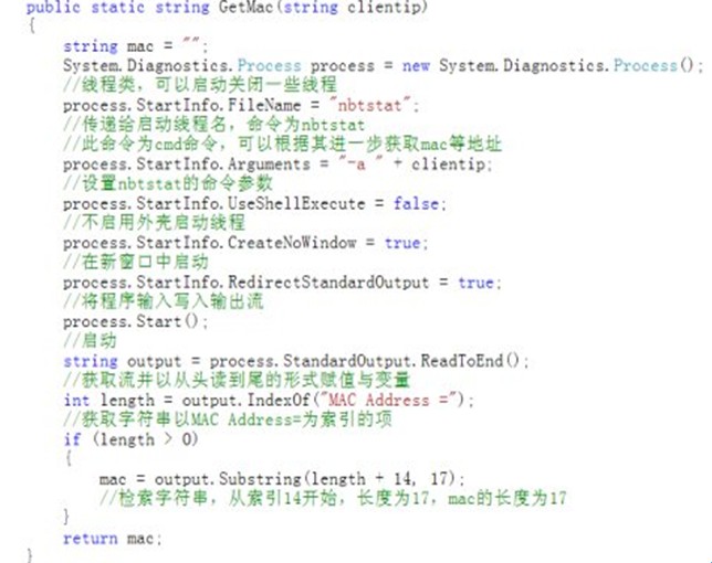 當(dāng)然,這個(gè)方法的核心就是ntbstat這個(gè)方法,就是配置參數(shù)獲取內(nèi)網(wǎng)或者遠(yuǎn)程計(jì)算機(jī)的一些你需要的東西,這個(gè)你需要什么就配置什么,比如代碼中 “-a + clientip”,-a就是獲取mac物理地址,根據(jù)后面的變量clientip(這個(gè)是傳入的參數(shù),為ip字段)。