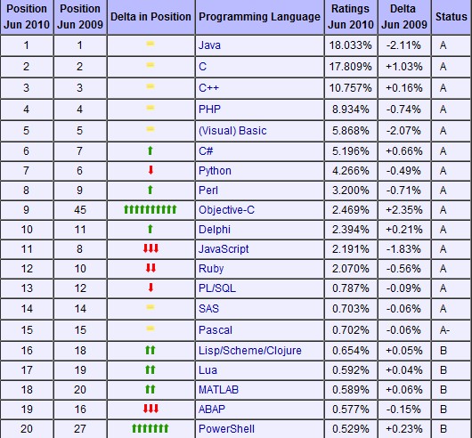 Google Go面世后發展一度異常迅猛,還被評為“TIOBE2009年年度語言”。但在新奇性驅動的發展勢頭過后,Go語言需要找到自己在語言之林的一席之地,有些人認為Go語言對多核的支持正是當前我們需要的重要特性,也有人批評Go語言對于真正的開發者來說還不夠成熟。讓我們耐心等待Go在下個月的表現吧。