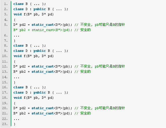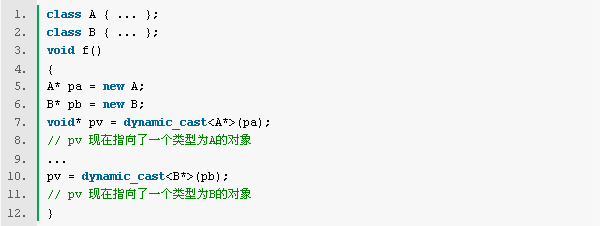 表達式static_cast<T*>(a), a的值轉(zhuǎn)換為模板中指定的類型T.在運行時轉(zhuǎn)換過程中,不進行類型檢查來確保轉(zhuǎn)換的安全性。