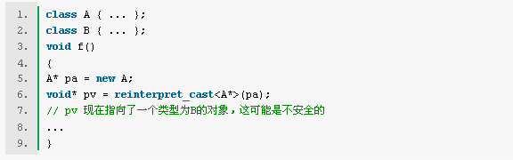 表達式reinterpret_cast<T*>(a)能夠用于諸如char* 到 int*,或者One_class* 到 Unrelated_class*等類似這樣的轉(zhuǎn)換,因此可能是不安全的。