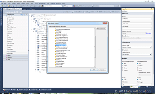 設計器一旦打開,便可選擇其中一個日期時間段。自從“Hire Date”采用了日期和時間這兩個元素,“Hire Date”似乎顯得非常具有意思。在屬性窗口中,將控件類型改為自定義控件,然后點擊更改鏈接來指定自定義控件類型。接下來,會有一個對話框提示你,要求你選擇要使用的控件類型。