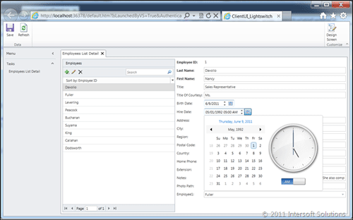 在本篇文章中,我將展示ClientUI’s UXDateTimePicker如何取代默認的日期和時間選擇器,以提供更具吸引力的日期和時間選擇。假設你已經準備好了一個簡單的LightSwitch項目,此時,請打開屏幕設計器。在我的示例中,我采用員工詳情列表,其數據來源于Northwind數據庫。