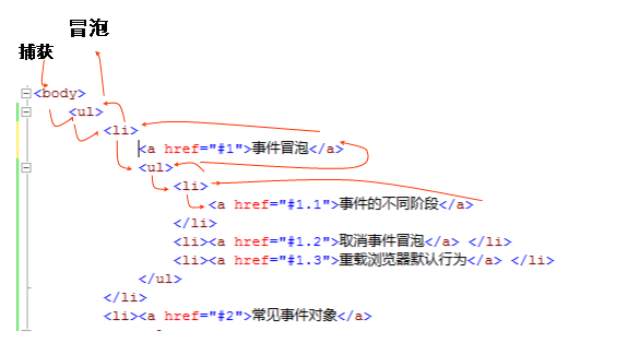如下圖的Dom結構中如果指向錨點#1.1的鏈接被點擊,則依次會觸發document > body > ul > li > ul > li > a 的Click處理函數。至此完成捕獲階段。當這階段完成,開始冒泡階段,如圖中向上箭頭的順序。事件處理函數全部觸發。有興趣可以移步,可以看到動態的過程。