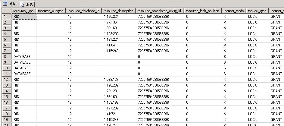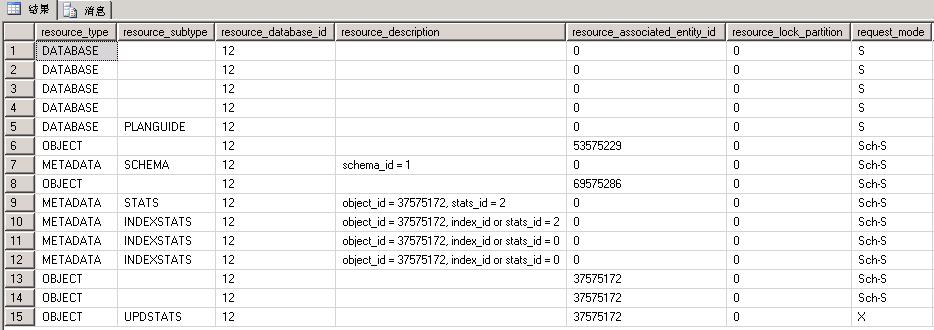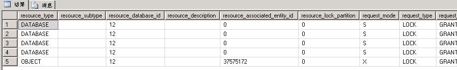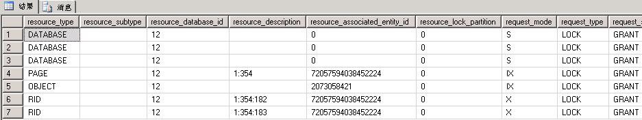 從上圖中看出這個(gè)快照中有:三個(gè)數(shù)據(jù)庫(kù)共享鎖、一個(gè)頁(yè)級(jí)意向排他鎖、一個(gè)表級(jí)意向排他鎖、兩個(gè)行級(jí)排他鎖。