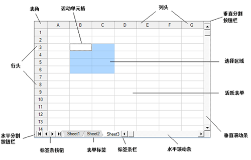 Spread控件是由與滾動條相結合共同來顯示數據的表單組成。如果有多個表單,一個標簽條里可以有多個標簽。 下面的圖片顯示了Spread控件的主體部分。其中的多個部分可以被隱藏,但這里展示了默認的顯示。