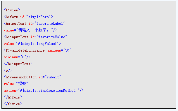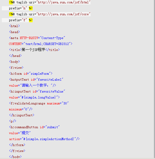 在聲明后是幾行標準的HTML語句,本文不再詳述。從 f:view 開始,是一段JSF語句。這段代碼如下所示: