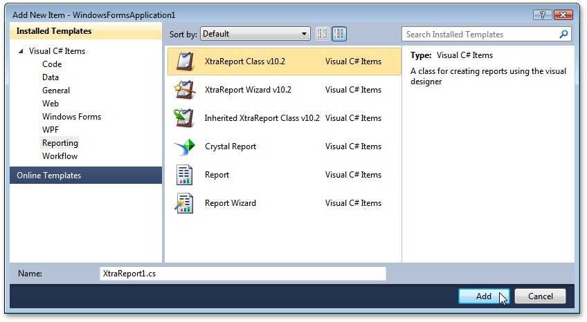 4、在此對話框中,選擇 XtraReport Class v10.2 項,并且單擊 添加 按鈕。 這樣將把一個空白新報表添加到應用程序中。