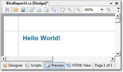 運行此應用程序。 單擊 Preview 按鈕調(diào)用 預覽窗口,其中包含了所創(chuàng)建的 Hello World! 報表。 要 打印 報表,只需要單擊 Print 按鈕
