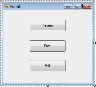 現(xiàn)在切換到 Form1 的設計器,并且在窗體中添加三個 System.Windows.Forms.Button 控件。 分別把它們的文本修改為 Preview、Print 和 Edit。