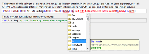 在上面的編輯器,我們在網絡語言附加中使用了先進的XML語言。你可以看到我是如何開始鍵入新的標簽,并且我還使用的syntax語法高亮和自動IntelliPrompt,就像在一個正常的多行SyntaxEditor控制一樣。并且在編輯器中也出現了波浪線,這說明有語法錯誤。