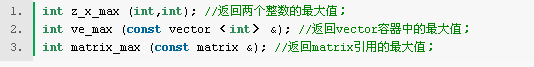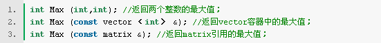 上面的三個函數都可以大概地說成判斷一組數中的最大值,對于函數的用戶來說,他們并不關心函數定義的細節,也就是說他們不關心判斷兩個整數的大小和判斷數組(vector容器)數的大小應該使用不同的函數,而對于程序的設計者來說這可是不得不想到的。程序員必須記住并查找每個函數名。而函數的重載把程序員從這種問題的復雜性中解放了出來,C++提供了這種支持。上面的三個比較大小的函數可以定義成: