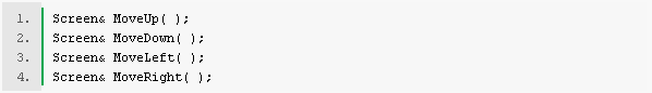 看過這四個函數不言而喻,它們是控制光標在屏幕上的位置的,即:向上移動光標,向下移動光標,向左移動光標,向右移動光標。如果我現在把它們寫成重載函數,每個都是Screen& Move( );顯然對于程序員來說是不易理解的。因此對于函數重載的使用我們應遵循應用的邏輯,而不是簡單地因為它的存在就必須使用它。程序員不應該勉強使用重載函數。