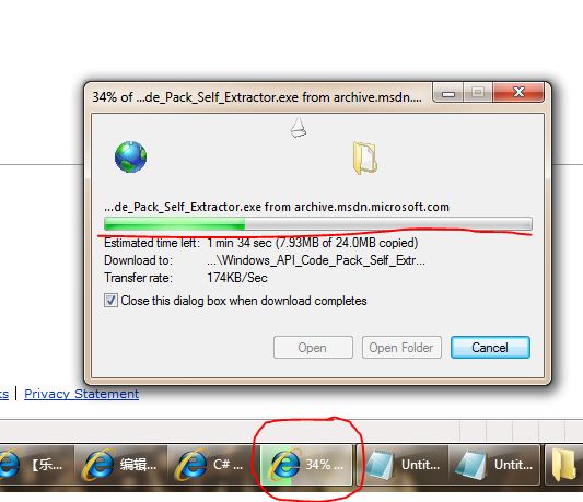 Windows7提供了許多不錯的用戶體驗,諸如窗體背景透明、玻璃磨砂效果、任務欄的JumpList定義以及任務欄進度條顯示等等。伴隨著這些 特效的出現,Windows在底層也提供了相應的API支持,使得開發人員可以根據需要非常容易地在自己的應用程序中實現這些效果。如果你是原生的C++ 追隨者,那恭喜你了!你完全可以毫無障礙地去使用這些API,前提是你需要閱讀龐大的開發文檔。如果你是新生的.NET開發人員(姑且還是將.NET developer稱之為新生者吧,畢竟咱比C++出來得晚),也沒有關系,微軟在msdn網站中也發布了專門的Windows7 API托管類庫,專門用于在.NET應用程序中調用。先來看看IE瀏覽器在Windows 7下下載文件時任務欄的進度條顯示吧,相信很多人都不會陌生,如果你還聞所未聞,要么是你已經out了要么就是你從來就沒有關注過Windows 7的這些細節。