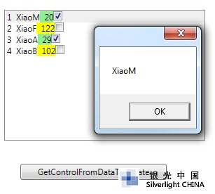 效果圖: 當(dāng)選中第一項(xiàng),然后單擊"GetControlFromDataTemplate"按鈕,則彈出第一項(xiàng)中控件的內(nèi)容XiaoM。