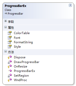為了讓ProgressBar控件可以顯示進度完成的信息,添加了一個屬性:FormatString來格式化進度條完成信息,通過這個屬性,可以定義自己需要顯示什么樣式的信息,默認為:{0:0.0%},即顯示:50.0%。來看看類視圖: