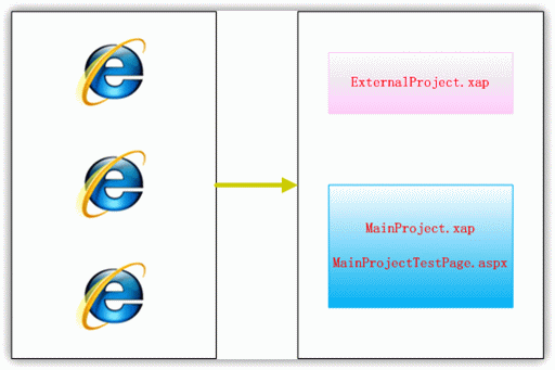 現在我們先來看一下需求,大致是這樣子的,在服務端我們有兩個xap文件,其中MainProject.xap文件將會在 MainProjectTestPage.aspx中引用,而ExternalProject.xap文件中的UserControl將會在 MainProject.xap文件中訪問,并進行顯示,如下圖所示: