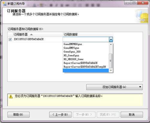 4、選擇訂閱服務器上的存放同步過來的數據的一個或者多個目標數據庫。如下圖: