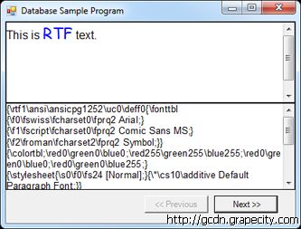 該示例程序包含一個(gè)Form和兩個(gè)Text Control控件。兩個(gè)Text Control控件顯示的是數(shù)據(jù)庫(kù)中的同一條記錄,上面的控件顯示的是格式化文本,下面的控件顯示的是相應(yīng)的RTF源碼。點(diǎn)擊【Next】按鈕將保存當(dāng)前 記錄,并顯示下一條記錄。