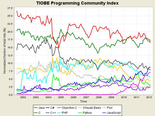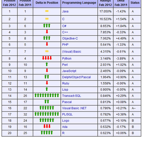 TIOBE 2012年 2 月編程語言排行榜已經(jīng)發(fā)布,本月 C# 擠進前三,占領(lǐng)季軍位置,C++降至第四名。Visual Basic 慘遭冷談,呈現(xiàn)下滑趨勢;而 VB.NET 受到了開發(fā)者們的追捧,進入榜單前 20 名,從上個月的 24 位躍至16位。從走勢圖中可看出,Objective-C依然發(fā)展迅猛,榮膺 2011 年度語言桂冠。其他編程語言值得關(guān)注的有:Groovy 逐漸逼近榜單前 20,CFML(ColdFusion)回歸至 Top 50,排名 44 位。
