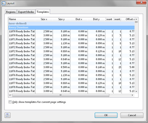 5、通過Project > Page Setup來選擇標簽格式。在"Templates"標簽中,從預定義的標簽格式中選擇你想要的標簽模板。該模板自動設置了各個標簽的大小,出現在頁面上的標簽數量以及分布。