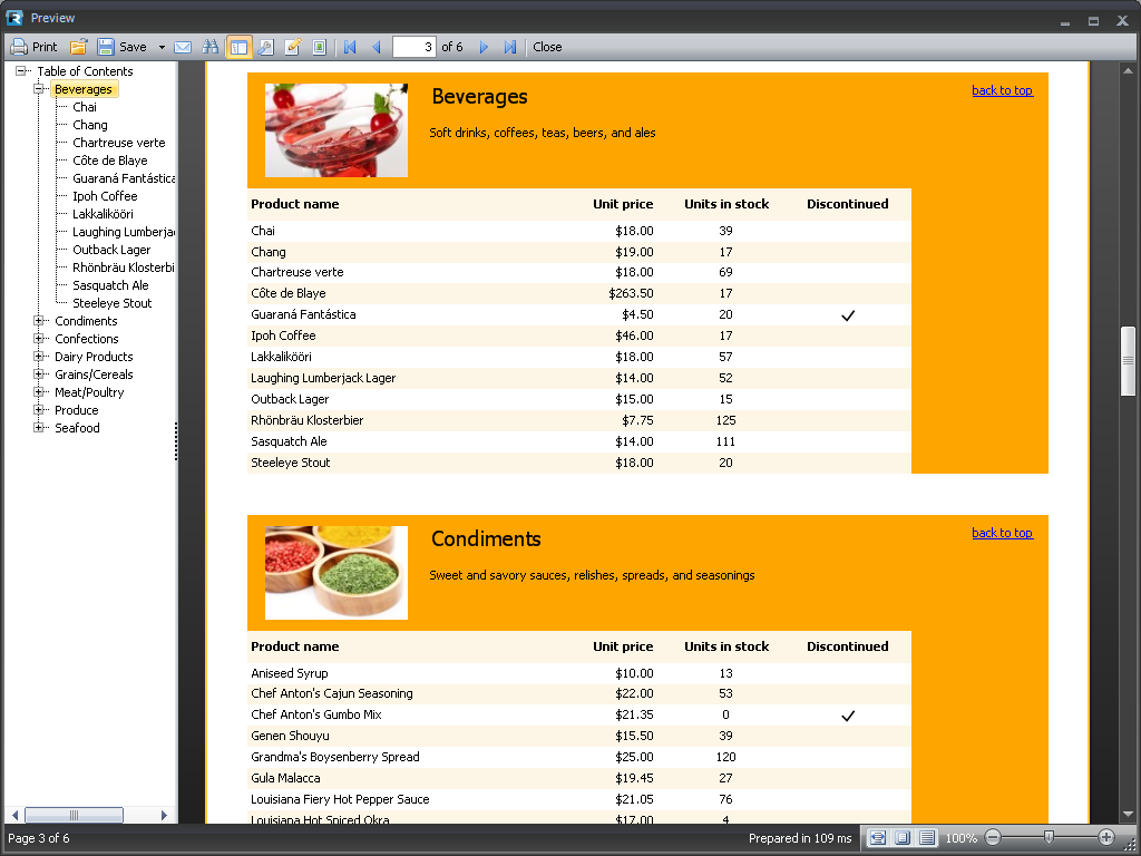 提供預覽窗口中的導航。當您在設計報表時,您可以用其定義報表元素來形成一個報表大綱,這個大綱會展示在預覽窗口中。當您點擊一個大綱項目,預覽窗口會自動滾動到該指定的項目。您也可以定義一個活動項目來接受鼠標點擊的指令,它可以完成導航至另外的報表元素或者外部URL。