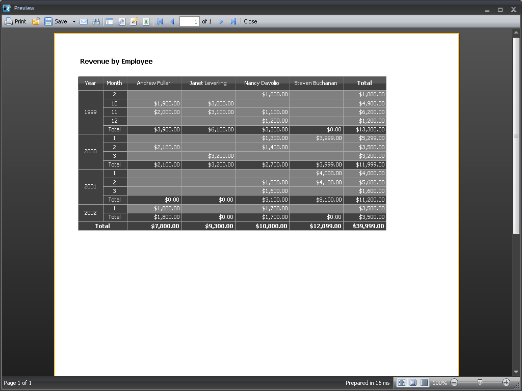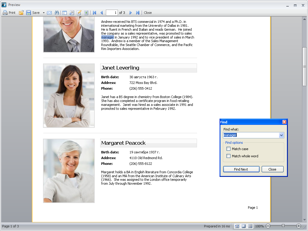 FastReport.NET提供方便的MS Word樣式的預覽窗口,支持在報表預覽狀態中進行文本搜索,還支持在報表預覽狀態中進行修改。