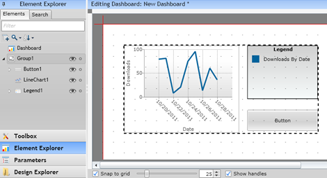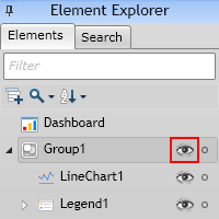 當你設計了一個有很多控件和重疊組的儀表盤時,你可以在設計時暫時隱藏某些組,以便你可以集中精力在當前需要操作的元素上。要隱藏某個組,單擊Element Explorer右邊的Toggle Visibility按鈕,如圖所示:
