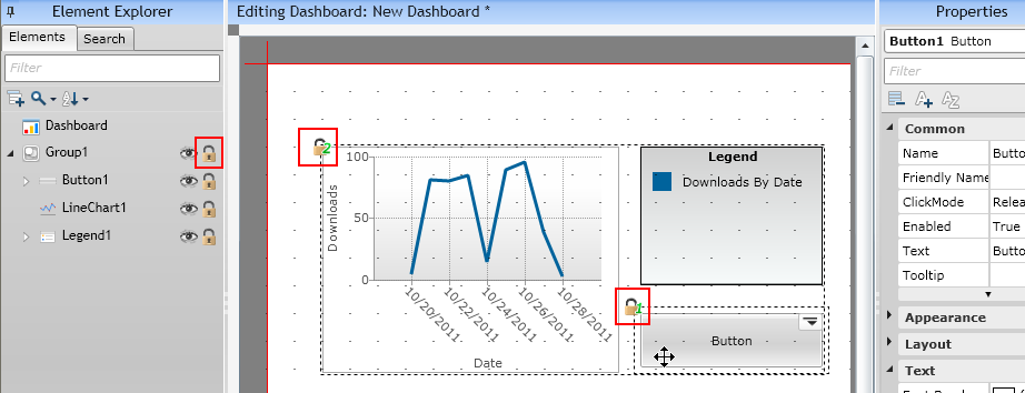 在Element Explorer中,你可以通過切換組項右邊的鎖圖標,輕松鎖定或解鎖某個組(以及它里面的所有控件)。當某個組被鎖定時,你不能在畫板上移動這個組,這可以防止意外更改了已經完成的儀表盤控件。
