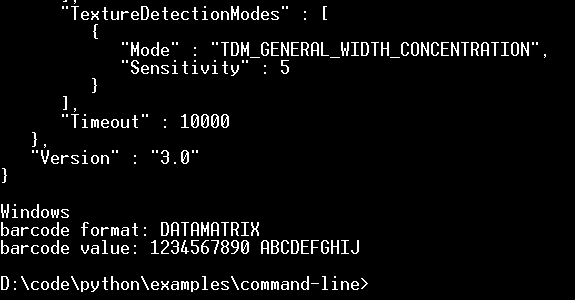 <font style="vertical-align: inherit;"><font style="vertical-align: inherit;">從dbr導入DynamsoftBarcodeReader</font></font><font></font><font style="vertical-align: inherit;"><font style="vertical-align: inherit;"> dbr = DynamsoftBarcodeReader()</font></font><font></font><font style="vertical-align: inherit;"><font style="vertical-align: inherit;"> dbr.initLicense('LICENSE-KEY')</font></font><font></font><font style="vertical-align: inherit;"><font style="vertical-align: inherit;"> 結果= dbr.decodeFile(fileName,dbr.BF_ALL)</font></font><font></font><font style="vertical-align: inherit;"><font style="vertical-align: inherit;"> 結果:</font></font><font></font><font style="vertical-align: inherit;"><font style="vertical-align: inherit;"> 打印(“條形碼格式:'+結果[0])</font></font><font></font><font style="vertical-align: inherit;"><font style="vertical-align: inherit;"> print('條形碼值:'+結果[1])</font></font><font></font>