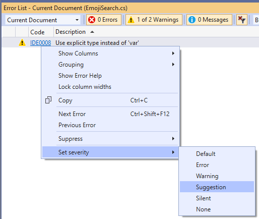 現在可以直接通過錯誤列表配置代碼樣式規則的嚴重性級別。將光標置于錯誤、警告或建議上,右鍵單擊并選擇設置嚴重性。接下來,選擇要為該規則配置的嚴重性級別。這將使用規則的新嚴重性更新現有的EditorConfig。它也適用于第三方分析程序。