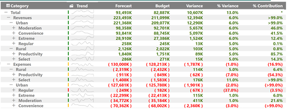 通過“等級差異表”,您可以與層次表布局中的度量進行比較,并查看差異、差異百分比以及對整體的貢獻方式。如果包含日期字段,那么您還可以在表格中看到迷你圖。