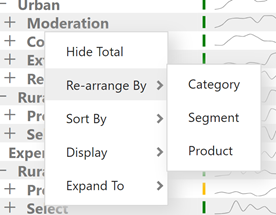 右鍵單擊行標頭可以重新排列層次結構的順序、隱藏或顯示總計、更改排序順序、擴展到層次結構的特定級別或顯示和隱藏不同的列標頭。