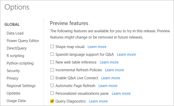 要啟用它,請在“選項”的“預覽功能”下啟用“查詢診斷”。