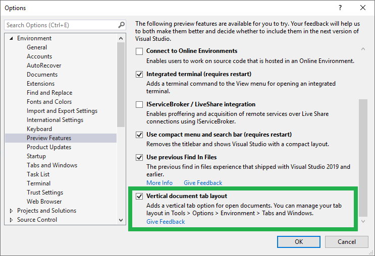 要嘗試使用垂直標(biāo)簽,請通過轉(zhuǎn)到工具>選項(xiàng)>環(huán)境>預(yù)覽功能啟用垂直文檔標(biāo)簽布局功能。啟用此功能后,您將可以在“ 工具”>“選項(xiàng)”>“環(huán)境”>“選項(xiàng)卡和Windows”下查看垂直選項(xiàng)卡的其他設(shè)置,并可以通過“文檔”選項(xiàng)卡的右向輕松地在三個(gè)方向(左,右和上)之間更改選項(xiàng)卡布局。單擊上下文菜單。