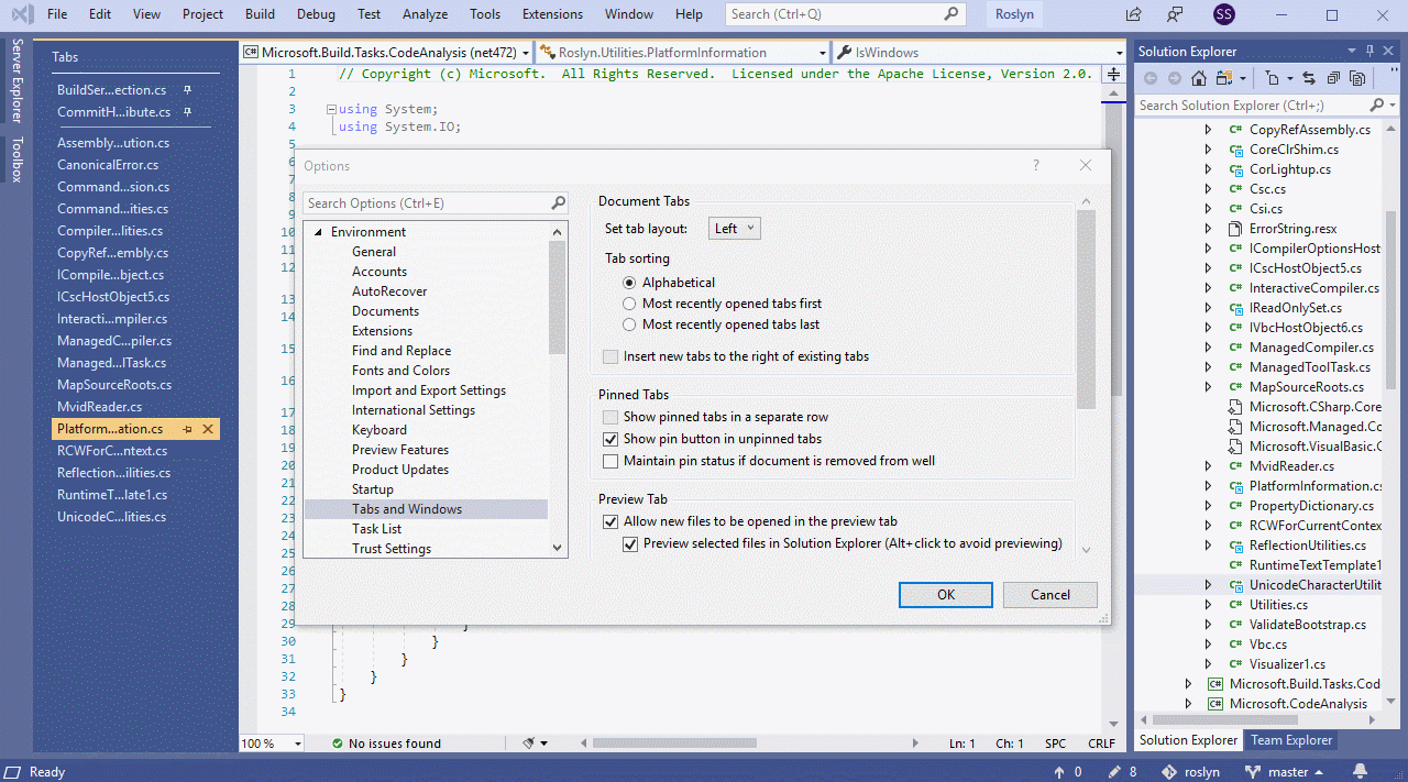 掌控標(biāo)簽的打開方式。除了默認(rèn)的字母排序之外,Visual Studio v16.4預(yù)覽版2還添加了通過最近打開的選項(xiàng)卡打開功能。盡管字母排序具有固定的順序,但是最近打開的頁面可讓您在打開標(biāo)簽后重新排列標(biāo)簽的順序。