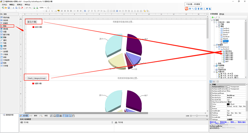我們使用ActiveReports報表后,開發圖表更加簡單方便,只需拖拽一個圖表控件,然后給圖表數據分組、類型分組、子分組都選擇好數據源里提前配置好的字段即可,簡單易用,完全不需要再考慮怎么繪制各種圖形、文字、直線,而且這個圖表控件有各種可視化展示類型: