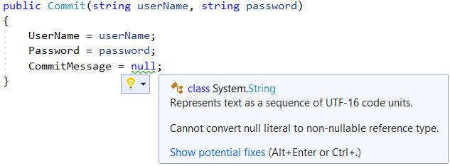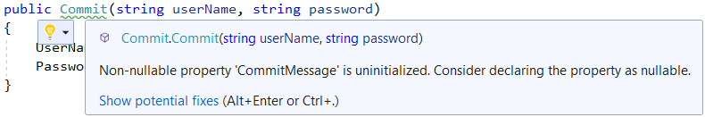 仍然會顯示警告。現在,通過將其聲明為可為空的字符串(string?),使CommitMessage屬性接受null。