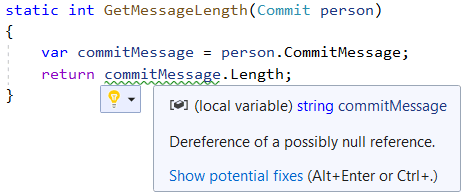 嘗試訪問CommitMessage的長度時,警告將消失,并且新警告將顯示在Program.cs類中。
