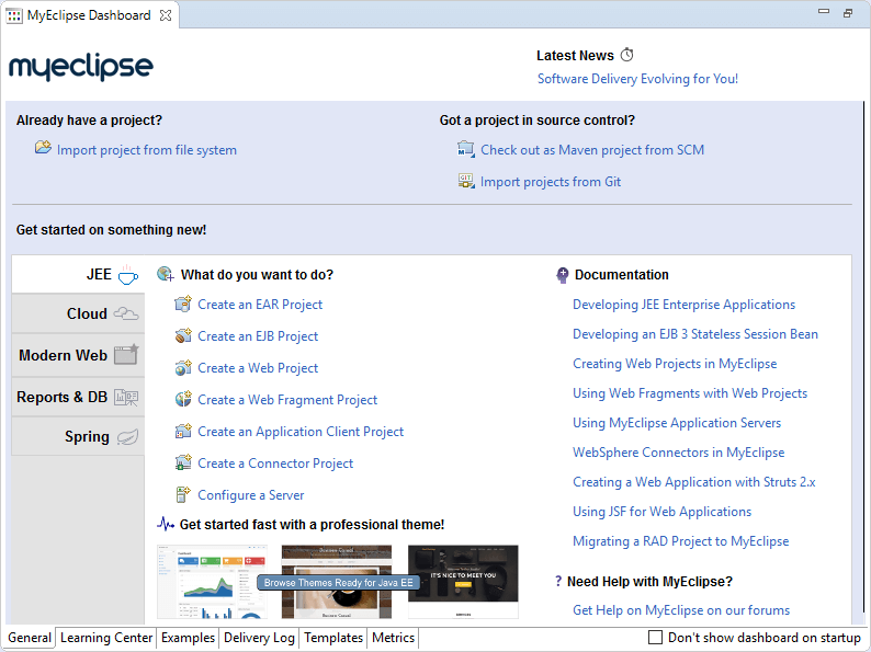 MyEclipse Dashboard視圖使您可以快速開始新項目。您可以找到指向新項目向導、項目導入、源代碼控制中的項目和相關幫助主題的快速鏈接。單擊與要創建的項目類型對應的標簽,以查找與該項目類型相關的鏈接。