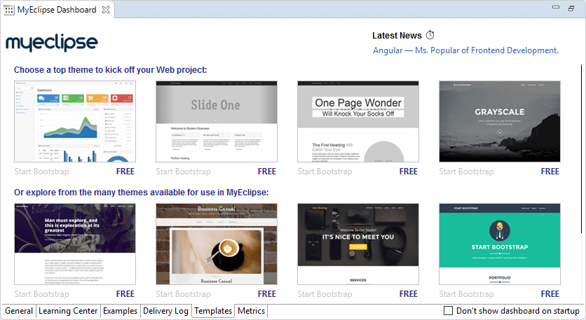 Dashboard視圖將在MyEclipse透視圖中自動打開。要在啟動時禁用儀表板,請選中“Dashboard”視圖底部的“不要在啟動時再次顯示此Dashboard”復選框。使用主工具欄上的Open Dashboard圖標可打開MyEclipse Dashboard。如下圖: