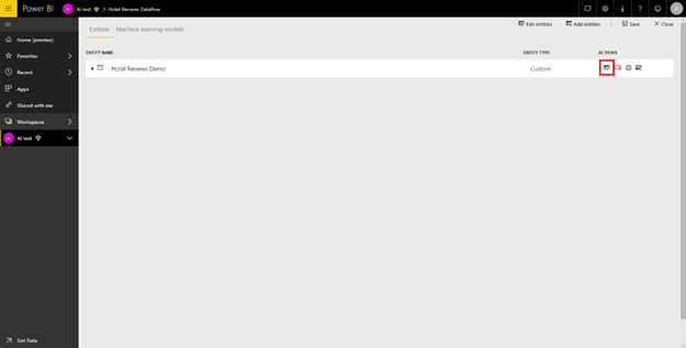您可以直接從數(shù)據(jù)流中的Power查詢編輯器中調(diào)用授予您訪問權(quán)限的任何Azure ML模型。要訪問Azure ML模型,請為您想要從Azure ML模型中獲得更多見解的實體選擇Edit按鈕,如下圖所示。