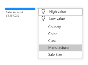 如果您選擇高值或低值進行擴展,標題旁邊還會看到一個燈泡,提示您Power BI正在為您動態選擇該字段,并且該字段會隨著數據刷新而更新和更改。連接線也是虛線,作為另一個視覺提示。