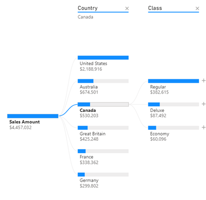 分解樹可用于通過查看組中各個類別對整體的貢獻來執行根本原因分析。 視覺效果使您可以分解或分解組,以查看其各個類別以及如何根據所選度量(例銷售額)對它們進行排名。