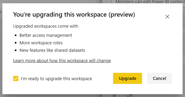 3、查看對(duì)話框信息。如果已在工作區(qū)中發(fā)布或安裝內(nèi)容包,則會(huì)收到警告。準(zhǔn)備就緒后,選中“我已準(zhǔn)備好升級(jí)此工作區(qū)”,然后選擇“升級(jí)”。