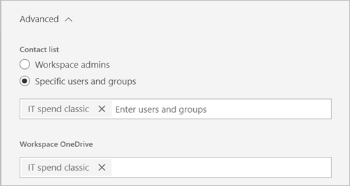 2、在“高級(jí)”設(shè)置中將工作區(qū)“聯(lián)系人列表”配置為從中升級(jí)工作區(qū)的Office 365 Group。你可以將更多的用戶或組添加到聯(lián)系人列表,或?qū)?其切換到工作區(qū)管理員。